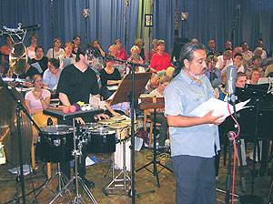 René Aguilar vor dem Chor und der Percussion-Gruppe bei der